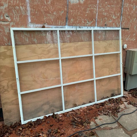 En enkelt rude mangler samt en side af karm knækket af