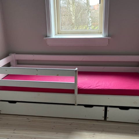Sengen er brugt og har brugsspor. Skufferne trænger til en omgang med søm i bunden, ellers fejler sengen intet.