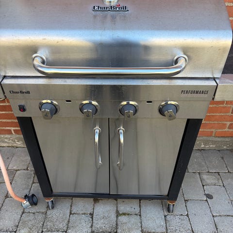 Char‑Broil Performance gasgrill i rustfrit stål og sort kabinet. Grillen har tre hovedbrændere med separate betjeningsknapper på frontpanelet.