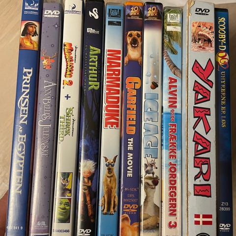 Børnefilm - Disney, Astrid Lindgren, et par gamle danske film og mange andre film og tegnefilm. Byd hvis du ser nogen du gerne vil have. De har ligger længe i skuffen - og er ikke tjekket for ridser - men sender også gerne billeder af DVDen.
