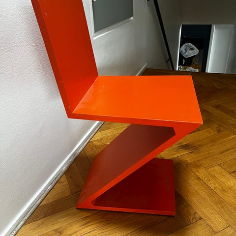 Jeg sælger en udgave af Rietveld-stolen Red Blue Chair som er designet af Gerrit Rietveld i Bauhaus stil. Stolen er formentlig bygget efter hans offentliggjorte tegninger og er derfor ikke signeret.