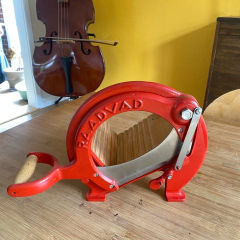 Severin rugbrød/pålægsmaskine i grå plast og metal. Maskinen har rund skæreskive og justerbar skærevogn til skæring af fx brød, kød og pålæg. Den står på en stabil base og tilsluttes med almindelig netledning. Egnet til brug i køkkenet til præcis skæring af skiver i forskellige tykkelser.