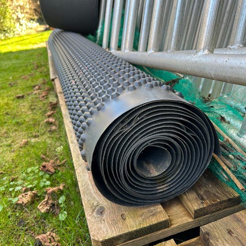 Platon grundmursplade i sort plast. Pladen har nopret overflade og leveres på rulle, velegnet til dræn og beskyttelse af udvendig kælder- og fundamentvæg mod fugt og mekaniske påvirkninger. Kan anvendes ved nybyggeri eller renovering, hvor der ønskes afstand mellem mur og jord for forbedret dræning og ventilation.