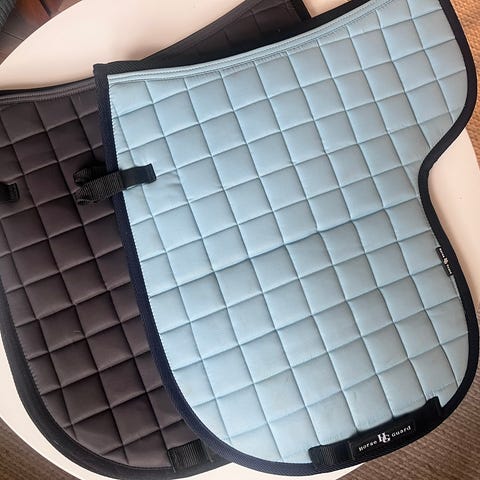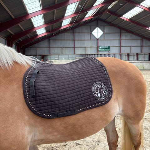 HG pony allround sadelunderlag i blå farve med gennemgående mønster og små HG-logoer. Størrelse mærket som Pony AP, egnet til allroundbrug 😊