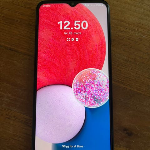Samsung Galaxy A13 smartphone med 128 GB intern hukommelse. Modellen tilhører Galaxy A-serien og har en lys blå bagside. Telefonen har flere bagkameraer og frontkamera i skærmens øverste kant. Der medfølger et lilla folio-cover med kortholder og vindue til kort eller billede samt indvendig sort holder til telefonen. Egnet til almindelig brug som opkald, beskeder, internet og apps med god lagerplads til billeder, video og filer.