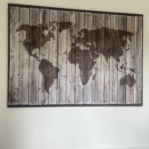 NYT WORLD MAP BILLEDE IKEA, BREDDE 118 CM, HØJDE 78 CM, 1,5 CM DYB. PRINT PÅ LÆRRED MED FLOTTE DETALJER SOM FØLGER MED RUNDT OM RAMMEN. NB ER VAREN AKTIV ER VAREN TIL SALG. SENDES IKKE.