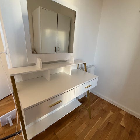 Velholdt toiletbord med ovalt spejl i hvidmalet træ. Bordet har tre skuffer med kontrastfarvede fronter og drejede ben. Velegnet som sminkebord eller skriveplads i soveværelse eller garderobe.
