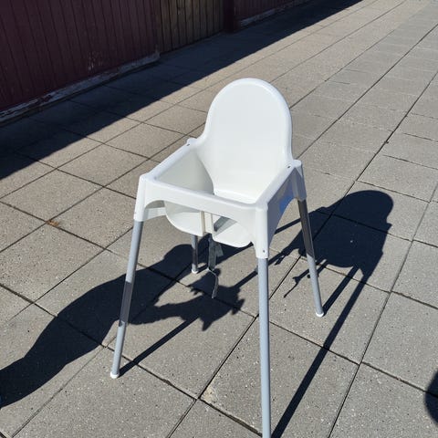 IKEA højstol i hvid plast. Består af to hvide sæder og tilhørende grå ben. Højstolen er beregnet til små børn og kan bruges ved spisebordet eller andre borde, hvor barnet skal sidde højt og stabilt. Plastmaterialet er let at rengøre med en fugtig klud.