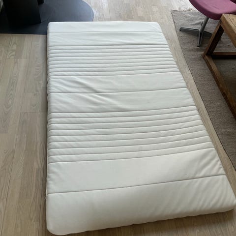 IKEA topmadras i hvid. Topmadrassen er polstret og har et quiltet overfladedesign. Velegnet som ekstra komfortlag på seng eller madras. Farven er hvid, og materialet er tekstil med skumfyld indeni. Str. 120 x 200 cm. Næsten ikke brugt