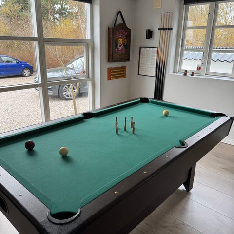 Snookerudstyr: Ekstra lange køer, lamper, pointtavle og køholder i træ.