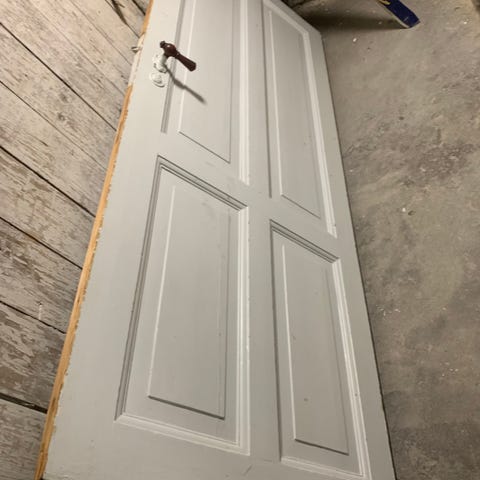 Hvid indvendig fyldningsdør med tre fyldninger. Døren har klassisk profilering og er udstyret med dørgreb og lås. Velegnet som værelses- eller gangdør i bolig. Materiale fremstår som malet træ eller trækomposit i lys, neutral farve, der passer ind i de fleste indretninger.