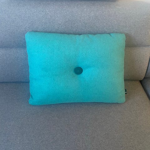 Fin og velholdt pyntepude fra Hay i blå uld med grå knapper på den ene side og turkisblå knapper på den anden side.
