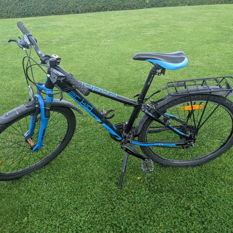 RAAM børnecykel med 26" hjul. Cyklen har sort stel med blå detaljer og stænkskærme monteret for og bag. Stelstørrelsen er angivet til 40 cm på stellet, hvilket passer til større børn. Velegnet som hverdagscykel til skolekørsel og fritidskørsel på både vej og lettere grusveje.