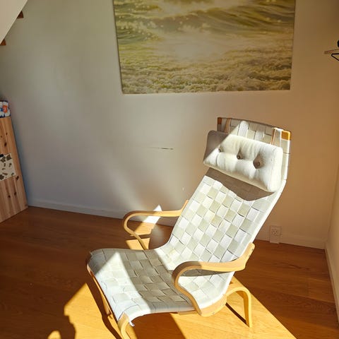 Bruno Mattsson stol med plette på flettet ellers er stabil og fint i træet.