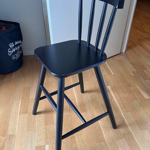 AGAM juniorstol i lakeret træ. Trænger til at blive efterspændt og evt. en klat lim under sædet hvor fineren er gået fra.