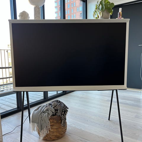 Samsung Flip digitalt whiteboard med 55" skærm i hvid. Interaktiv skærm monteret på mobil gulvstander med hjul, som gør den nem at flytte mellem mødelokaler eller undervisningsrum. Skærmen kan bruges både lodret og vandret, og stativet har lille hylde til f.eks. computer eller tilbehør. Velegnet til præsentationer, møder og undervisning, hvor der er behov for digital tavlefunktion og visning af indhold fra eksterne enheder.