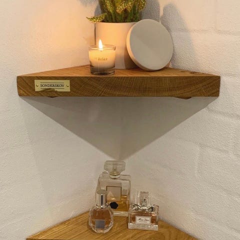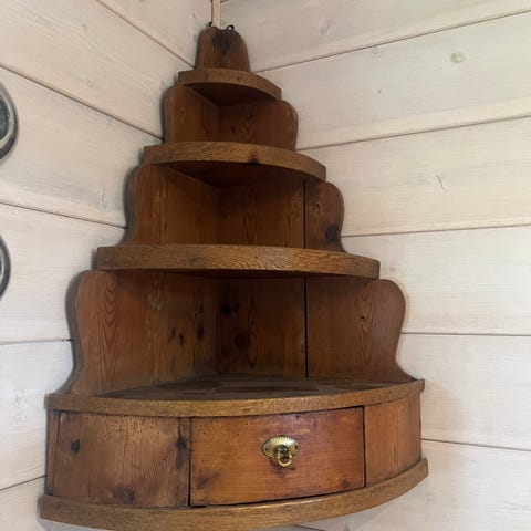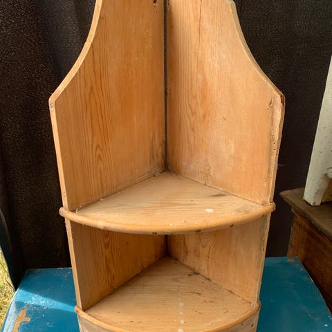Hjørnemøbel i udskåret træ, med tre hylder. lys bemaling , kan hænges op eller stå på gulvet. Bredde og dybde mål er på den underste hylde.