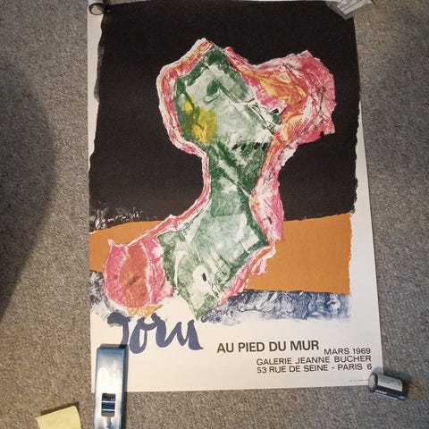 Asger Jorn I begyndelsen var billedkunst plakat. Motiv i stærke, abstrakte farver med figurative elementer.