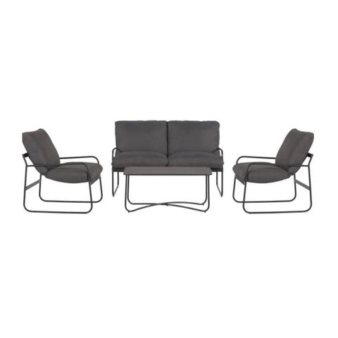 Allibert havesæt loungesæt i sort (mat af solen) med hynder. Sættet består af en to-personers sofa, to loungestole og et lavt bord.