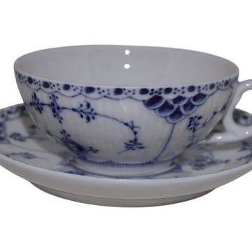 Royal Copenhagen Musselmalet Riflet, lille chokoladekop med tilhørende underkop.