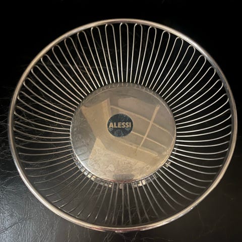 Alessi skål kurv i rustfrit stål. Åben trådkonstruktion med rund fod og solid bundplade i metal. Velegnet som frugtskål, brødkurv eller til opbevaring på køkkenbord eller spisebord. Fremstillet i Italien, mærket "Alessi Inox 18/10 Italy" i bunden.