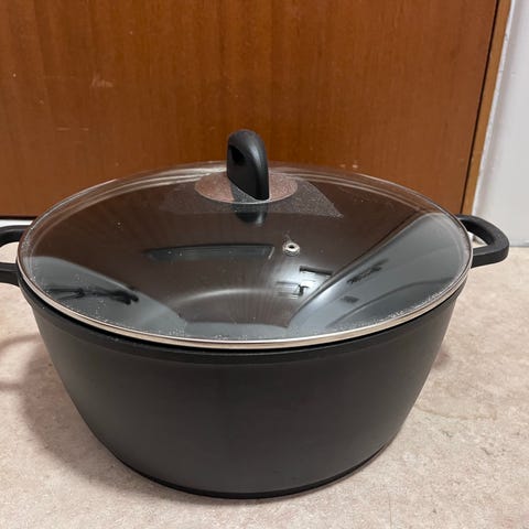 IKEA gryde med låg. Rund gryde med to håndtag og glaslåg med metalhåndtag. Inderside med mørk belægning og underside i metal med tekst "Cookware". Velegnet til madlavning på komfur. Størrelse og materiale ud over det viste på billederne er ikke oplyst.