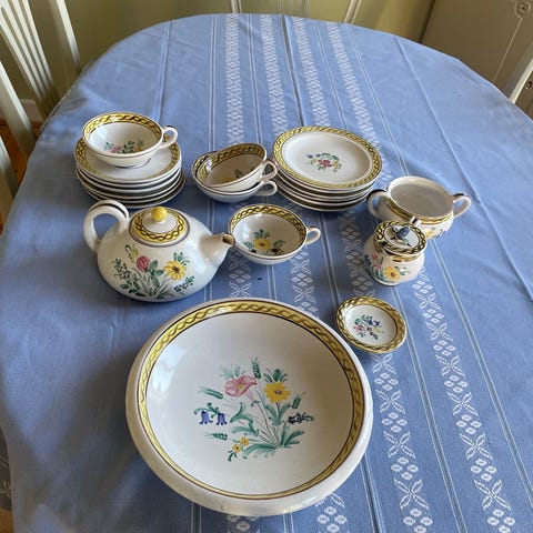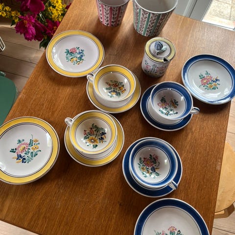 Lars Syberg stel i keramik med blå kant og dekoreret med blomster. Til 12 personer - kaffekopper, underkopper (15,5 cm), desserttallerkener (Ø 20 cm) og middagstallerkener (Ø 26 cm) + tekande. Stellet er uden skår og brud. Kun en enkelt middagstallerken har fået en lille flig slået af på siden.