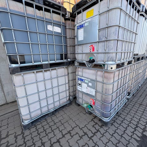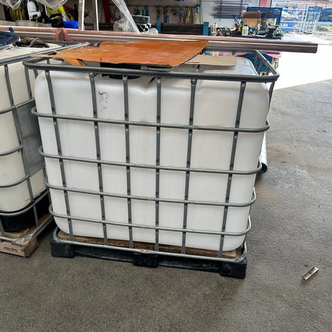 IBC tank plast beholder på ca. 1000 liter. Beholderen er omgivet af metalgitter og står på pallebund. Egnet som opbevaringstank til fx regnvand eller andre ikke-drikkelige væsker, afhængigt af tidligere brug og rengøring. Beholderen har tappeventil i bunden til aftapning.