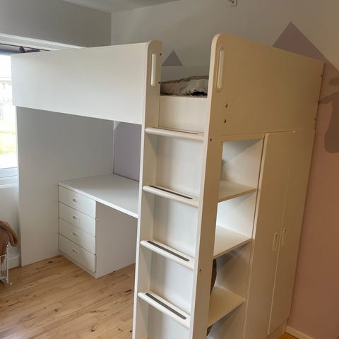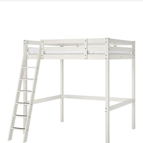 IKEA halvhøj seng i træ med sengehest. Sengen er udført i lyst træ med hvide sengeheste på langsiderne. Der er integreret stige i enden af sengen. Under sengen er der fri plads, som kan bruges til leg eller opbevaring. Velegnet som juniorseng eller børneseng i et børneværelse.