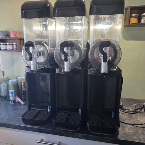 Slush ice maskine med 3 beholdere i sort kabinet. Maskinen er beregnet til fremstilling og servering af slush ice eller andre frosne drikke. Hver beholder har gennemsigtig top, så indholdet kan ses, samt indbygget snegl til omrøring. Fronten har drypbakker under hver tappehane. Bagsiden er udstyret med ventilationsgitter og betjeningspanel med individuelle kontakter til de enkelte beholdere. Velegnet til brug i kiosk, café, kantine eller ved arrangementer, hvor der ønskes servering af frosne drikke.