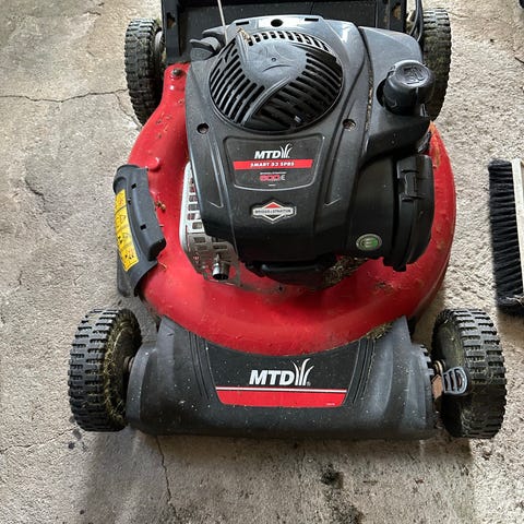 Briggs & Stratton Easy-Spin benzinplæneklipper. Plæneklipperen er udstyret med en benzinmotor med Easy-Spin startfunktion fra Briggs & Stratton. Håndtaget har blå greb og mekanisk betjening via wirer. Velegnet til klipning af græsarealer, hvor der ønskes en motoriseret løsning. Yderligere specifikationer som klippebredde og modelår fremgår ikke af billederne.