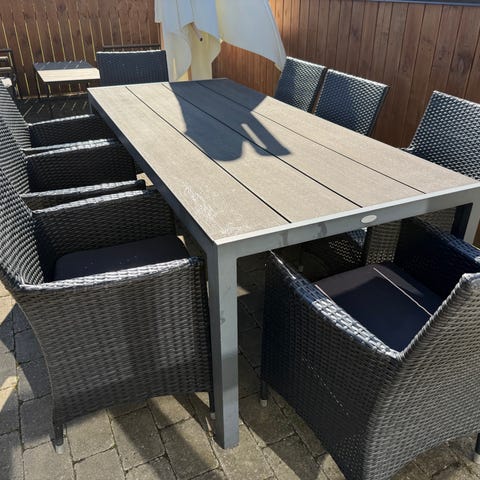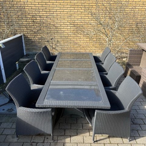 Havebord med 4 stole i gråt flet. Rektangulært bord med afrundede hjørner og flettet understel. Bordpladen er i flet med glasplade ovenpå. Stole i matchende flet med armlæn og høj ryg. Sættet er egnet til udendørs brug på terrasse, altan eller i have.