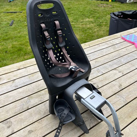 Hamax cykelstol til montering bag på cyklen. Cykelstolen er beregnet til børn op til ca. 22 kg. Den har integrerede fodstøtter med justerbare remme samt sele til fastspænding af barnet. Stolen monteres på stellet bag sadlen ved hjælp af medfølgende bøjlebeslag. Velegnet til transport af et barn på almindelig hverdagscykel.
