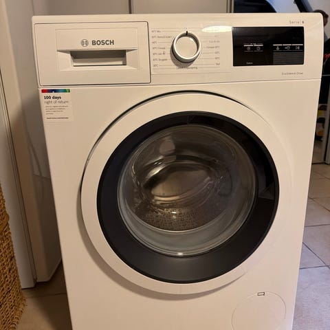 Bosch Serie 6 vaskemaskine, frontbetjent model WGG254ZESN med kapacitet på 10 kg. Maskinen er hvid og har frontbetjent låge med glas. Betjening via drejeknap og display på fronten. Egnet til almindelig husholdningsvask med stor tromlekapacitet. Kvittering på købet fremgår af billedet med pris og modelbetegnelse.
