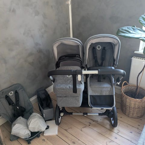 Utrolig flot og velholdt søskendevogn / tvillingevogn. Der følger 2 klapvognssæder, 1 barnevognslift, 2 carry handles, 2 kalecher, 2 regnslag, maxi cosi adapter til autostol (både single og duo), sidekurv med låg og varekurv med. Har punkterfrie hjul alt fungerer som det skal, virkelig lækker og nem vogn. Alt har stadig sin flotte sorte farve og alle greb er intakte. Alt tekstil er taget af og vasket i neutralt og vognen er vasket ned, smurt og gjort klar til ny familie.
