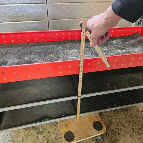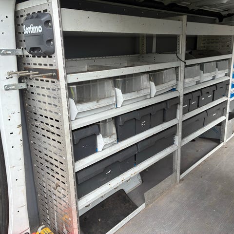 Varebil indretning med reolsystem og opbevaringsløsninger til montering i varebil. Systemet består af hylder, metalskuffer og plastkasser til sortering af værktøj og smådele. Reolerne er udført i metal med enkelte træplader og monteres langs siderne i varerummet. Indretningen er egnet til håndværkerbil eller servicevogn, hvor der er behov for organiseret opbevaring af materialer og udstyr under kørsel.