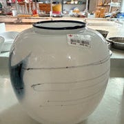 Rund glasvase med en elegant lyserød nuance og fine striber, håndlavet for et unikt design, perfekt til blomsterdekoration eller som stilfuld pynt.,Bemærk at mail, chat og beskeder ikke besvares, og varen skal købes på knappen "Gå til varen"