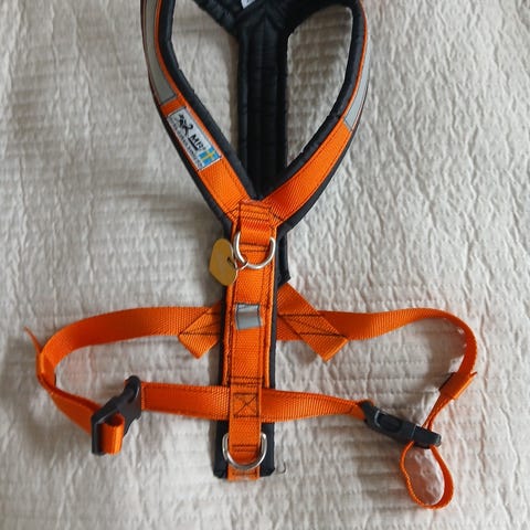 Kan justeres med spænder. Meget pæn sele, og ser ud helt som ny.