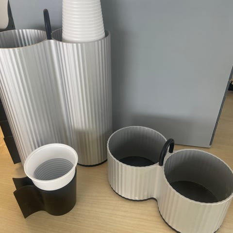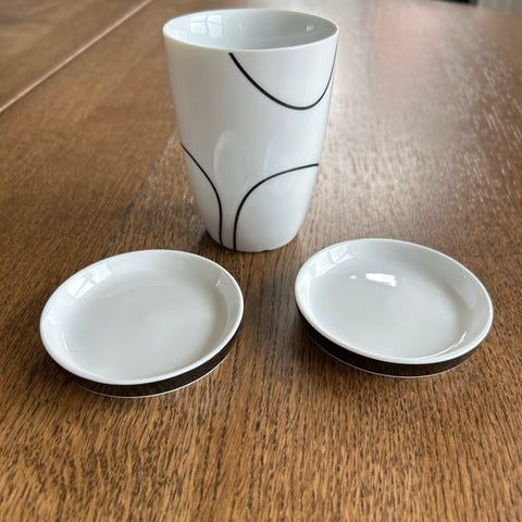 Menu Vea termokrus sæt i hvid porcelæn med sort, organisk stregmønster. Sættet består af to større krus på 210 ml og tre mindre krus på 80 ml, som egner sig til f.eks. kaffe, te eller espresso. Krusene er dobbeltvæggede termokrus, der hjælper med at holde drikken varm og ydersiden behagelig at holde på. Design: Vea, Menu.