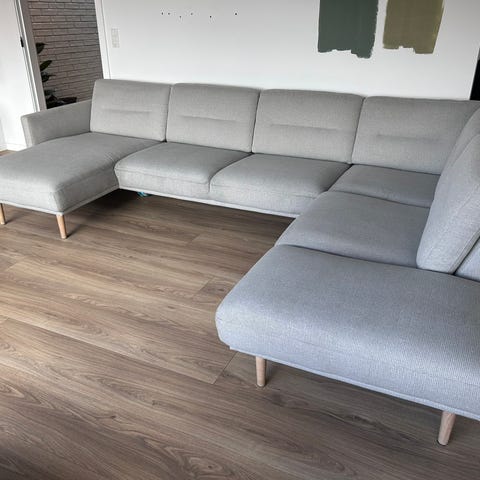 Velholdt hjørnesofa med chaiselong i lyst gråt stof incl. 2 nakkestøtter og med sorte metalben. Sofa er fra oktober 2023 og sælges pga flytning. Ny pris ca. 14.500.