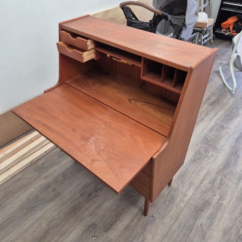 Klassisk dansk mid-century sekretær der kombinerer kompakt opbevaring med funktionel arbejdsplads.