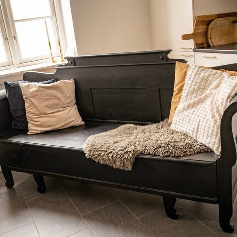 Hvid slagbænk med opbevaring, står flot