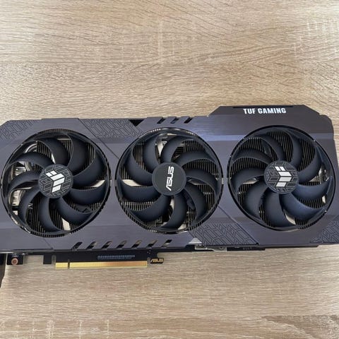 Nvidia GeForce RTX 3070 TI grafikkort 8GB med tre blæsere. Kortet har et køledesign med tre aksialblæsere og stor køleprofil. På bagpladen ses flere video-udgange, herunder DisplayPort og HDMI. Grafikkortet tilsluttes via PCIe i computeren og kræver ekstern strømtilslutning via 12-pins strømstik. Velegnet til stationære computere, hvor der er behov for dedikeret grafisk ydelse til f.eks. grafikarbejde eller spil, afhængigt af den konkrete RTX-model og systemets øvrige specifikationer.