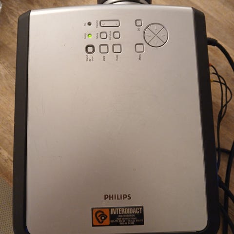 Philips Screeneo projektor i sort kabinet. Projektoren er en kortdistance-/ultrakortdistance-model, hvor billedet projiceres opad fra enheden. Enheden har indbyggede højttalere og betjeningsknapper på fronten. På bagsiden findes strømtilslutning, USB-port, netværksport samt lydindgange og -udgange. Velegnet til hjemmebiograf eller præsentationer, hvor projektoren kan placeres tæt på væg eller lærred.