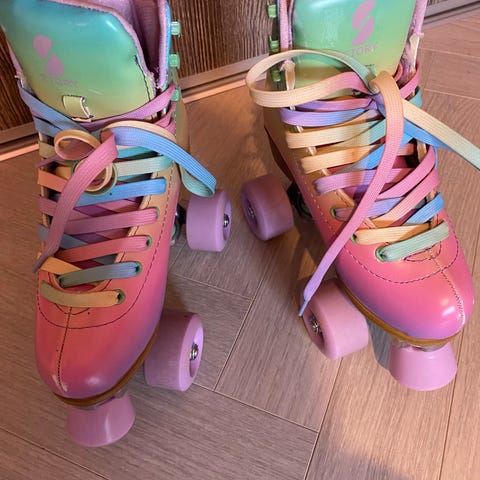 Story Funky rulleskøjter til børn i størrelse 27-30. Farvekombination i pink og blå med justerbare spænder og hård ydre støvle. Indersko i blødt tekstilmateriale. Rulleskøjterne har fire hjul og hælbremse bagpå. Velegnet til børn, der ønsker at køre på rulleskøjter udendørs på jævne underlag.