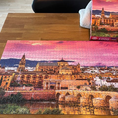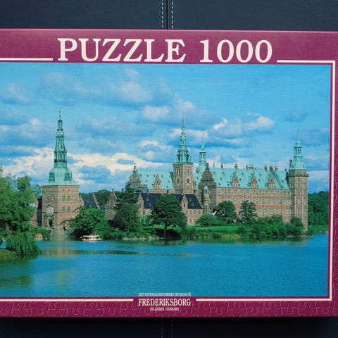 Puslespil med 1000 brikker. Motivet er: Quedlinburg Slot i Tyskland. Er lagt en gang. Der mangler ingen brikker. Fra et ikke ryger hjem. Prisen er 50 kr. Kan sendes mod betaling af fragt