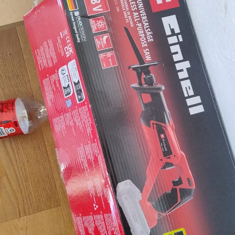 Einhell akku kædesav med 25 cm sværdlængde. Kædesaven er batteridrevet og leveres i rød farve med sorte detaljer. På billederne ses kædesaven sammen med batteri, lader og kædeolie. Velegnet til beskæring og opskæring af mindre træ- og haveopgaver. Plast- og metalkonstruktion med ergonomisk håndtag og kædebeskyttelse på sværdet.