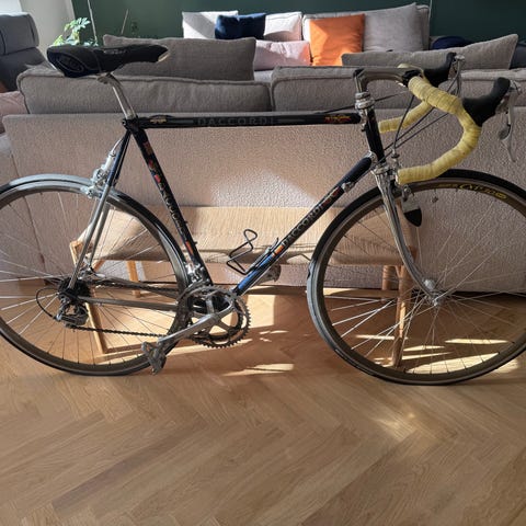 Sjælden og smukt opbygget klassisk italiensk racer fra Gios Torino i ikonisk blå med alle originale klistermærker, indgraveringer mv. Champagnolo 50th Anniversary gruppe med 22 karat guld noter - kun lavet i 15.000 eksemplarer. Nr. 1 er på museum, paven fik nr. 2. Cyklen er i imponerende flot stand!