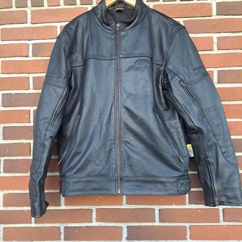 Blue MC læder motorcykeljakke og bukser sæt i sort, størrelse XL. Jakken har høj krave, lynlåslukning foran og brystlomme med lynlås. Indersiden er foret med mesh for bedre komfort og ventilation. Bukserne er udført i matchende sort læder med forstærkede knæpartier og paneler for øget slidstyrke. Sættet er egnet som motorcykelbeklædning og giver beskyttende beklædning til kørsel.
