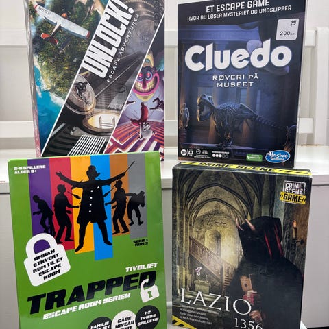 Labyrinth, Escape Room Spillet 2 og Hedbanz brætspil. Escape Room Spillet 2 indeholder tre escape room scenarier: Titanic, Alice in Wonderland og Another Dimension, med spilvarighed på ca. 60 minutter pr. spil. Hedbanz er et gæt-og-grin spil, hvor spillerne bærer pandebånd med kort og stiller spørgsmål for at gætte motivet. Alle tre er familiespil og egner sig til flere spillere.
